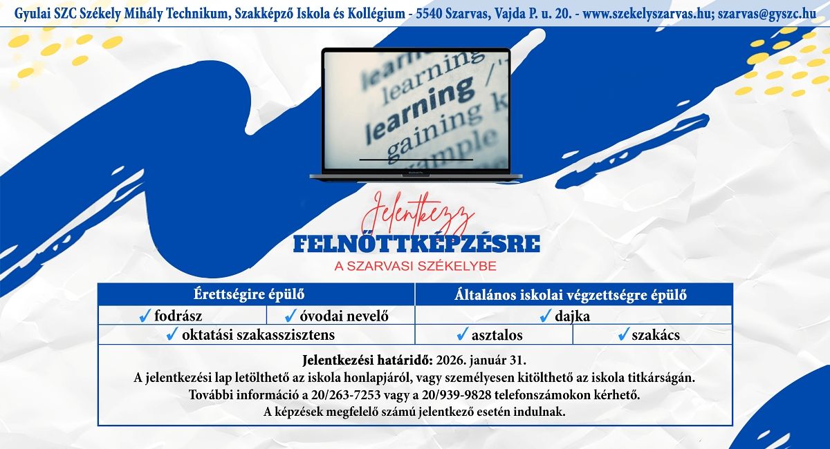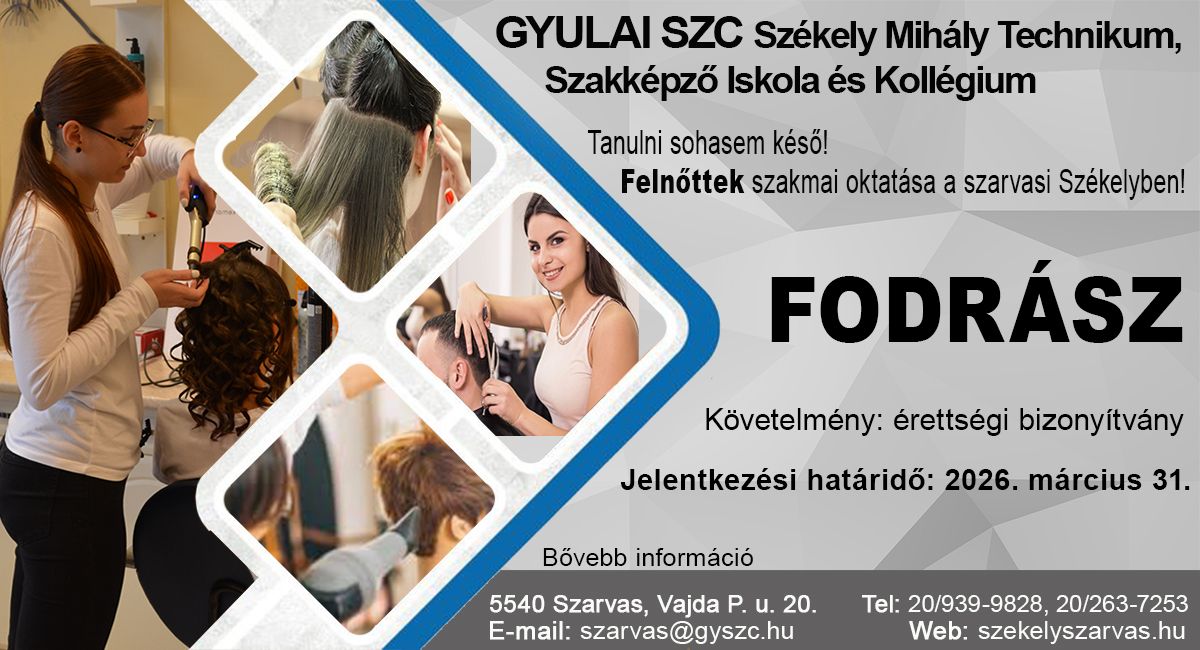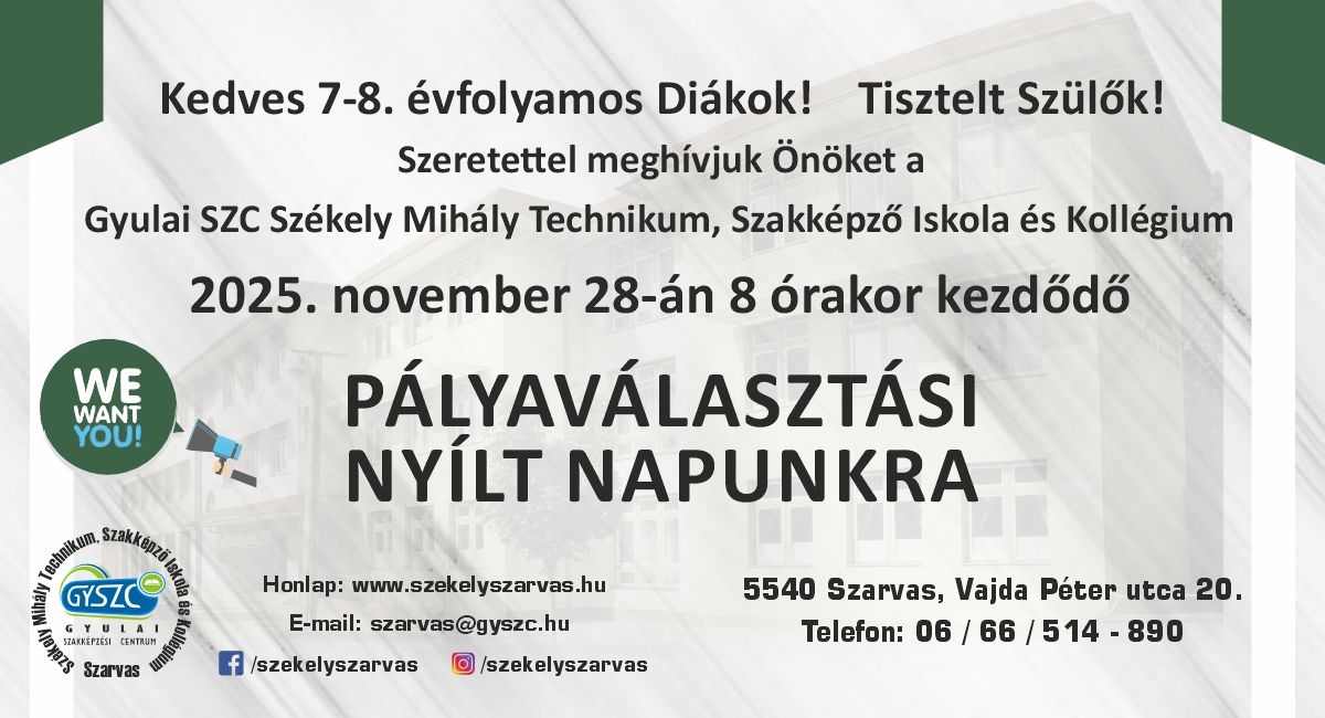 Szeretettel köszöntöm a Gyulai Szakképzési Centrum Székely Mihály Technikum, Szakképző Iskola és Kollégium honlapján!